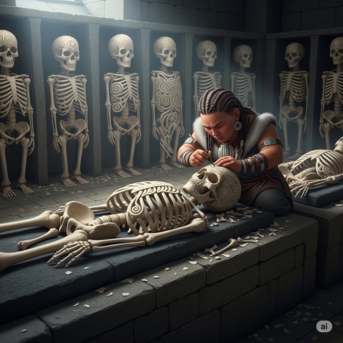 - Enshrinement in the Ossuary: Once the carving is complete, the skeleton, now a unique and sacred biography, is carefully reassembled and given a place of honor in the clan’s Great Ossuary. The soul is believed to have passed through the Ivory Gate, but their life’s story, their true essence, now remains forever as a source of wisdom and inspiration for the living.