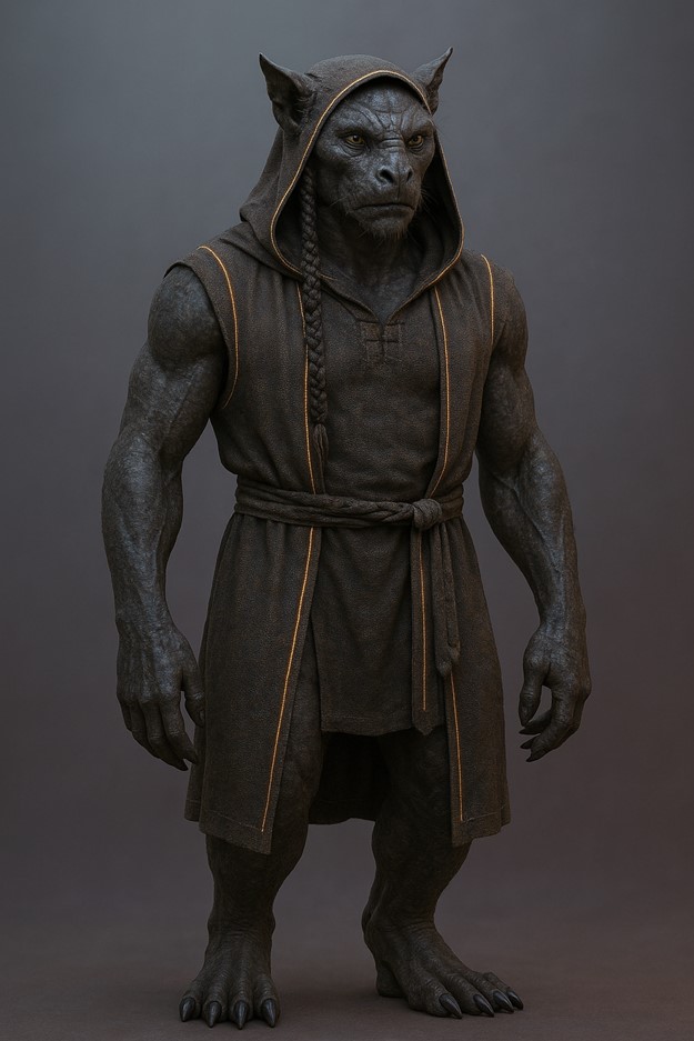 Tags: Veilstalker, Shadow Adapted, Humanoid Avatar, Leathery Mottled Skin, Coarse Patchy Fur, Gray Brown Black Shades, Extended Limbs, Wide Palms Feet, Clawed Digits, Broad Chested Torso, Prominent Brows, Deep Set Eyes, Large Pointed Ears, Nictitating Membranes, Subcutaneous Webbing, Iridescent Mist Markings, Dense Musculature