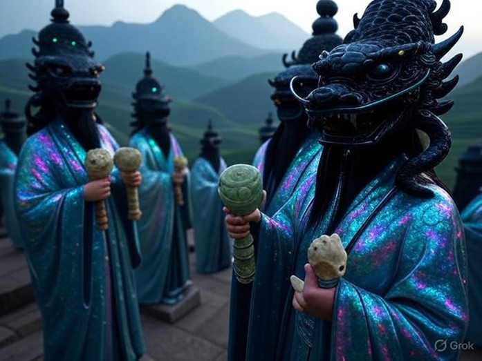 Symbols of Heitao Long proliferate throughout Longshan, with the primary emblem being a coiled dragon encircling a black pottery vessel, often etched into city gates, airship hulls, or personal gear like claw sheaths, representing creation from clay and the cyclical nature of existence. Jade gui scepters, elongated ritual blades of green stone, symbolize authority and divination, carried by clergy during processions through mist-shrouded valleys or inscribed with Longyu runes for channeling mana. Cracked oracle bones, heated in fires to reveal prophetic fissures, adorn altars in every home and temple, serving as tools for daily guidance in skills training or magical pursuits. Volcanic ash motifs, scattered like glazes on banners fluttering from hot air balloons, evoke the deity’s fiery breath, while interlocking scale patterns on architecture mimic the dragon’s hide, providing both aesthetic and protective warding against malevolent spirits.