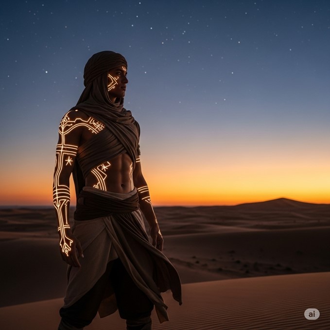 Tags: Qillqaruna, Humanoid, Avatar, Nazca, Desert Dweller, Arid Adapted, Glyph-Marked, Bioluminescent, Living Conduit, Inscribed Skin, Ruling Class, Royal Lineage, High Stamina, Heat Resistant, Pattern Recognition, Wiry Build, Geomancer