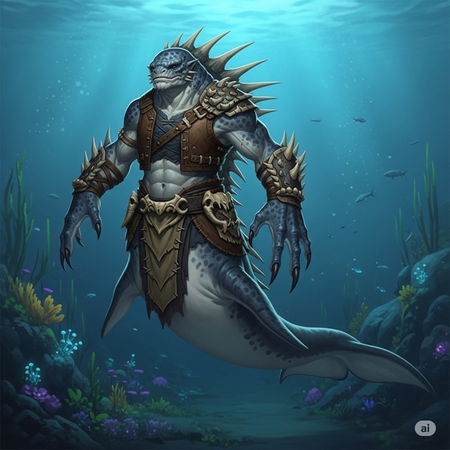 The Aglarr have a powerful, amphibious humanoid form that is brutally adapted to life in the crushing pressures of the deep sea. Their upper torso is humanoid but powerfully built, with thick, tough skin rather than scales. This skin is similar in texture to that of a shark or seal, and its coloration provides camouflage, ranging from the dappled greys of a reef to the abyssal blues and blacks of the deep. Their hands are webbed, and their knuckles and forearms feature natural, bony spurs and ridges which they often sharpen or adorn.