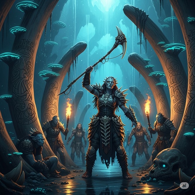 One season, Kethra and her pack hunted and killed a behemoth of the deep, a creature larger than any they had slain before. Its bones were thick as ancient trees, and its hide was a fortress. The hunt was a great victory, and Kethra’s pride was a sharp, shining thing. In her arrogance, she declared a new tradition.