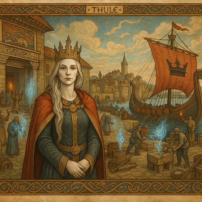 Tags: Thule, Skarvald, Deep Crown of Aegvildr, naval magic, harbor rite, war-galleon, Queen-Regent, rune-binding, maritime defense, corsair suppression.