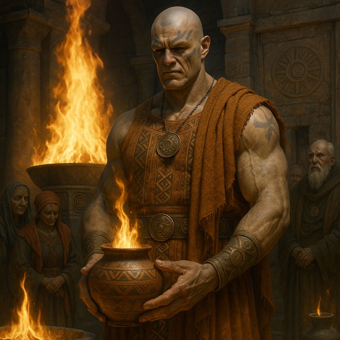In the age before the Urnfield knew kings, when clans wandered between stone ridges and great rivers, the dead were carried not to the soil but to the fire. Their bones were kept in urns sealed with ash and bronze, guarded in sanctuaries of woven walls and open skies. It was said that Varestris, the Hearthbinder, descended upon the smoke of these pyres, shaping the rising ash into visions of counsel for the living.