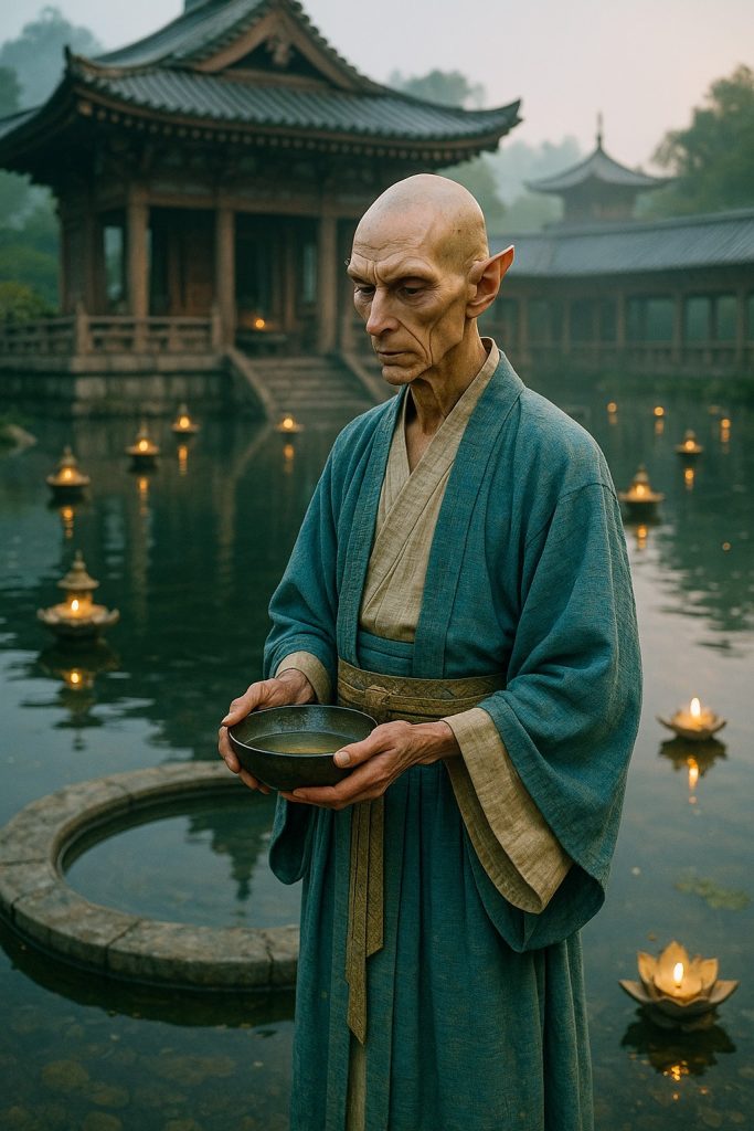 Then came a figure along the edge where the salt met the sweet. They were neither man nor woman, nor fish nor fowl, but something in between, cloaked in reeds and crowned with the pale crescent of the moon’s reflection. They said their name was lost but that the waves whispered it in the old tongue: Mizuho-no-Kami, the Keeper of the Rice Tide. Their eyes were twin lanterns of deep green, and their voice poured like warm rain.