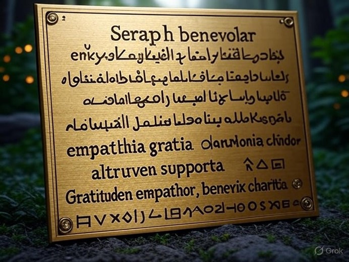 Meaning: Bind this treaty in gratitude, inspiring generosity across nations. - Sounds: Charitia supporten, benevolar selflessia.