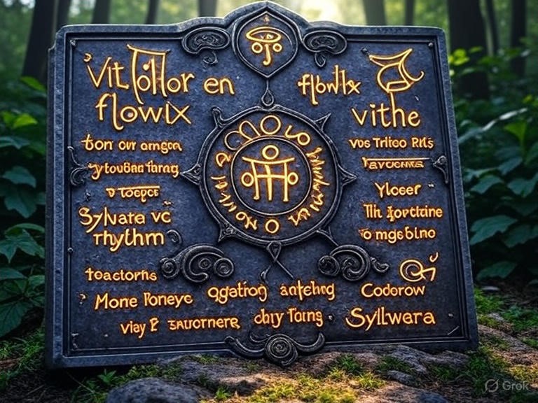- Sylvara ve rhythm, vitex dara (hummed in flowing rhythms resembling babbling streams on “sylvara”, empathic bonds sharing sensations of earth’s pulsing heartbeat, and rhythmic gestures flowing like vines climbing upward). Meaning: Carve the symbol of blooming meadows and whispering winds, inscribing the connection that nurtures every creature’s spirit across the vast web of existence.